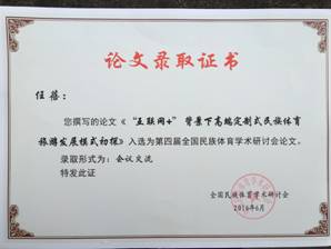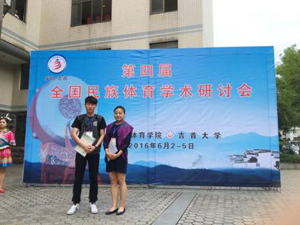 2016年6月2日-5日,由成都太阳集团tcy8722主办、吉首大学承办的第四届全国民族体育学术研讨会在湖南吉首大学召开。本次大会我校太阳集团tcy8722的任蓓和黄龙两位教师参加,共有两篇学术论文被大会录用,其中黄龙老师做专题报告一篇,并荣获“优秀论文”二等奖。参会过程中,我校教师准备充分、认真学习、积极讨论,顺利圆满的完成了专题报告和会议交流任务,并获得了相关专家的好评。