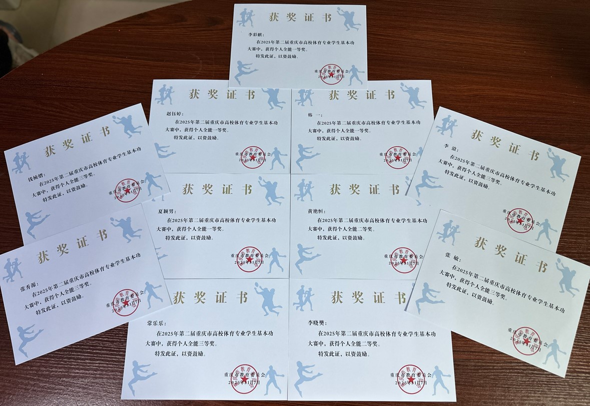 2025年10月17日—19日,由重庆市教育委员会主办的重庆市第二届高校体育专业学生基本功大赛在长江师范学院举行。该赛事共有12所开设体育专业的高校参加,我校学子凭借扎实的专业功底、顽强的拼搏精神与默契的团队协作,在激烈的角逐中不负众望,荣获团体二等奖,个人全能一等奖4名,二等奖2名,三等奖5名。其中,个人全能一等奖获奖数量位列全部参赛高校第二位。