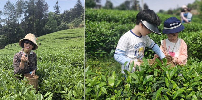 一下车,老师们就迫不及待戴上太阳帽、太阳镜,背着小竹篓,兴高采烈地奔向茶田,穿梭在翠绿无边的茶树林中,小心翼翼地用指尖摘下一颗颗嫩芽,轻轻地放进小竹篓里。他们或俯身细闻茶香,或拿出手机定格幸福时刻,充分享受着亲近自然的美好时光。伴随着竹篓里嫩芽的增多,老师们从最初的手忙脚乱到后来的逐渐娴熟,微风拂过脸庞,一幅悠然自得的采茶图便呈现在这群山环抱、绿树成荫、云雾弥漫的横山村。