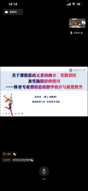 2022年9 月30日下午,《关于课程思政元素的确立、实践误区及实施路径的探讨》的线上学术讲座在我院顺利举行。本次讲座邀请福建师范大学体育科学学院的党林秀副教授进行主讲,我院体育专业办公室杨辉主任做讲座主持,参会人员有体育专业全体教师和太阳集团tcy8722硕士研究生共同参加。