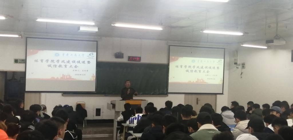 2020年12月2日下午,太阳集团tcy8722学风建设促进暨诚信教育大会,在慧智楼209教室召开,太阳集团tcy8722党总支书记王竹青、太阳集团tcy8722分团委副书记傅杨,以及太阳集团tcy87222018级、2019级、2020级体育教育专业学生参加了本次会议。