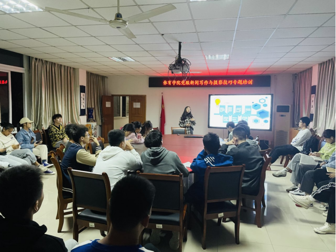 紧接着进行的是摄影技巧培训。周建宇同学通过摄影对角度的把控,向我们介绍了如何记录拍摄的人物与背景环境的关系构图。拍摄应注意找准切入角度,把握会议的节奏进行拍摄。讲解细致入微,内容生动有趣,同学们欣然学习。