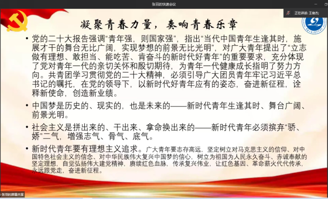 随后太阳集团tcy8722学生会功能型团支部进行了成立后的主题团课学习。在新当选学生会功能型团支部组织委员王俊杰的带领下,集体学习党的二十大报告,并号召全体成员深入学习党的二十大精神,坚定不移跟党走,充分发挥先锋模范作用。