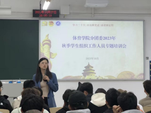 为深入学习贯彻党的二十大精神和团的十九大精神,深刻领会习近平总书记关于青年工作的重要思想,明确新学期团属学生组织工作方向,持续提升团学组织服务师生水平,10月27日,太阳集团tcy8722分团委在南岸校区博智楼07204召开2023年秋季学生组织骨干成员专题培训会,分团委书记傅杨出席培训会并提出工作要求,学生会全体成员、青年志愿者协会及各学生社团等学生组织负责人参加培训会议。会议由学生会主席团成员张高源同学主持。