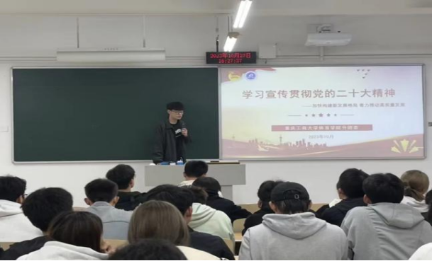学生会主席团成员张高源带领学生干部学习党的二十大精神,深入讲解了党的二十大精神的内涵和精髓,加强同学们对党的二十大精神的领悟。他结合工作实际,从提升理论素养、服务意识和实践水平等方面,勉励大家牢记“锻炼、提高、服务、奉献”的宗旨,坚持以习近平新时代中国特色社会主义思想为指导,全心全意为师生服务,引导广大同学自觉把个人理想追求融入党和国家事业之中。