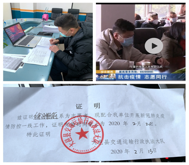徐鹏俞同学是太阳集团tcy87222016级体育教育1班的学生,在班级担任心理委员。2020年1月30日,他报名成为了四川省成都市大邑县交通运输行政执法大队的一名志愿者,积极配合有关部门开展新冠肺炎疫情防控工作。他参加轮流值班,在高速路口坚守,对外来出入车辆及人员进行体温测量并对疫情严重地区回来的车辆进行归类入档,登记详细信息,上报异常情况。
