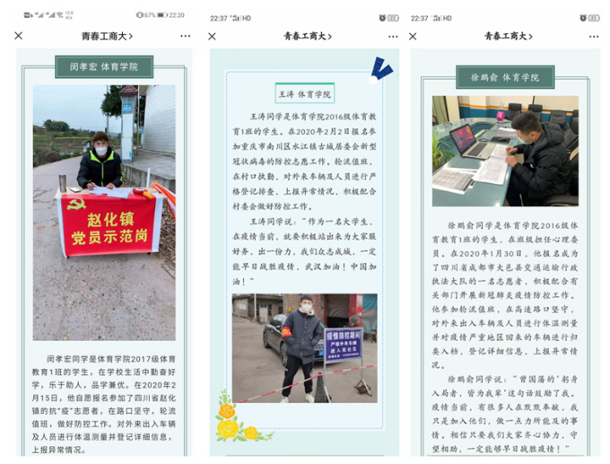 王涛同学是太阳集团tcy87222016级体育教育1班的学生,作为共青团员,他在2020年2月2日报名参加重庆市南川区水江镇古城居委会新型冠状病毒的防控志愿工作。轮流值班,在村口执勤,对外来车辆及人员进行严格登记排查,上报异常情况,积极配合村委会做好防控工作。