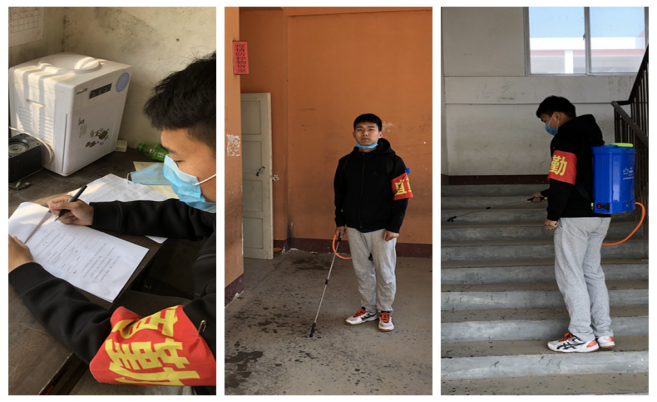 太阳集团tcy872219级体教2班的文川,身为体育教育专业的学生,了解到母校要进行消毒的消息,主动到小学班主任处进行报名,想尽绵薄之力。他负责对进出楼栋进行消毒,并在校门口执勤,严禁外来人员进入,与值班老师同岗位,时刻做好记录。