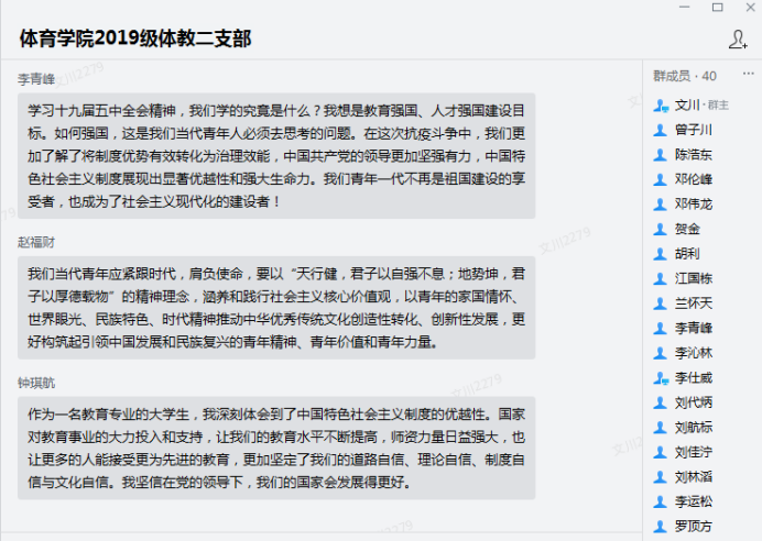新时代的青年,是当下的见证者和未来的亲历者,广大青年要深入学习贯彻习近平新时代中国特色社会主义思想,自觉主动学、及时跟进学、联系实际学、笃信笃行学,坚持把初心使命举过头顶,保持一份赤子之心,将青春融入国家的发展和民族的事业之中。理想是青春的旗帜,要志存高远、坚定信仰;学习是青春的阶梯,要珍惜韶华、刻苦求知。本次学习十九届五中全会精神,激励着太阳集团tcy8722每一位青年,同时希望同学们能认真学习党的十九届五中全会精神,用科学的思想武装头脑,不断提高思想觉悟,坚定理想信念,做一名合格的新时代青年!