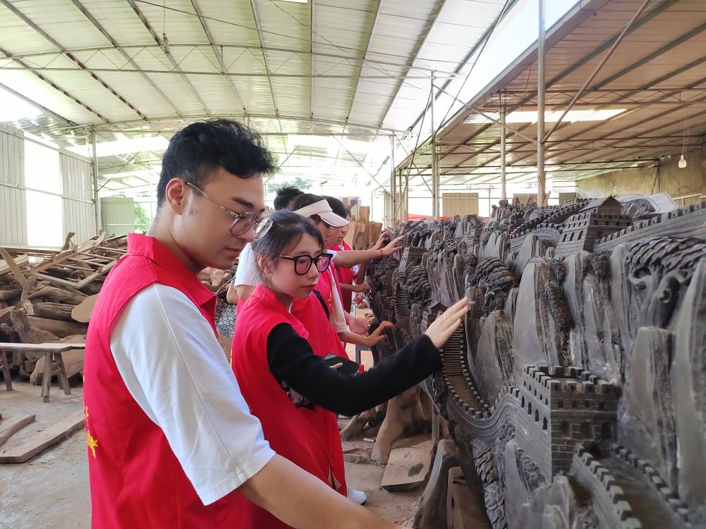 木雕艺术凝聚的是民族工匠精神的艺术结晶,其背后蕴含的是优秀的民族文化。志愿者们在古御工艺品基地见到了周氏木作第五代非遗传承人周奎,2017年,他创作的木雕《春夏秋冬》荣获中国工美“工匠杯”银奖。2018年,他和父亲创作的木雕作品《万古长青》荣获中国工美“工匠杯”金奖,这是重庆木雕首次获得此项殊荣。2019年,周氏木作获评重庆市非物质文化遗产代表性项目,周奎也获得重庆市工艺美术大师称号。