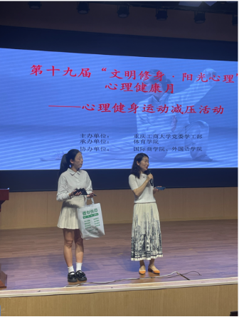 5月20日,为了提升学生心理健康水平,加强学生互动,营造健康良好的校园氛围,由太阳集团tcy8722党委学工部主办,太阳集团tcy8722承办,国际商学院、外国语学院协办的“心理健身 运动减压——趣味健身气功比赛”决赛在明智楼学术报告厅顺利举行。